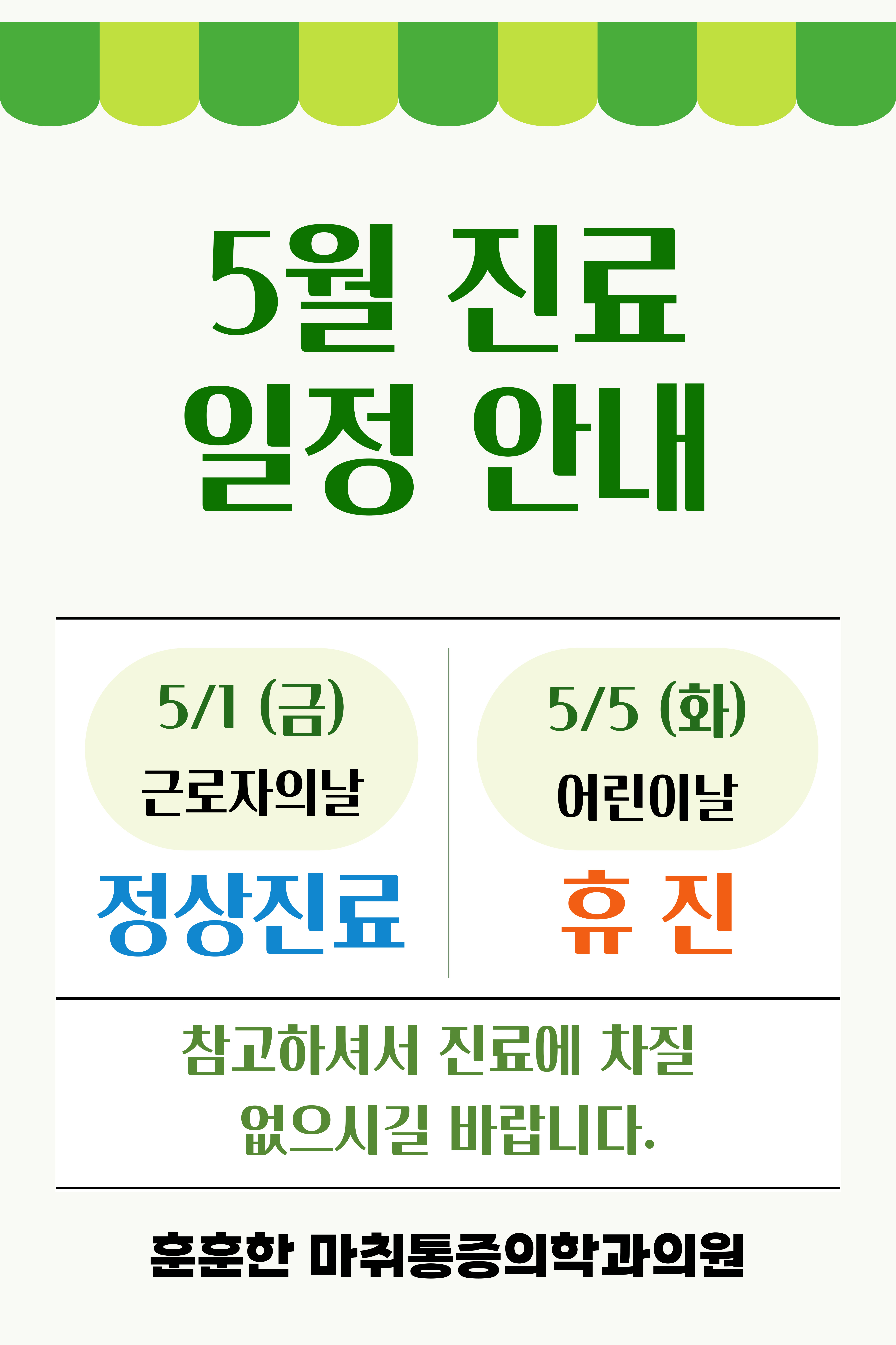 5월 1일(금) 근로자의 날 - 정상 진료, 5일(화) 어린이날 - 휴진