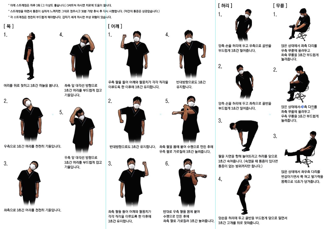 스트레칭 책자를 참고하여 집에서 자주 따라해주세요!